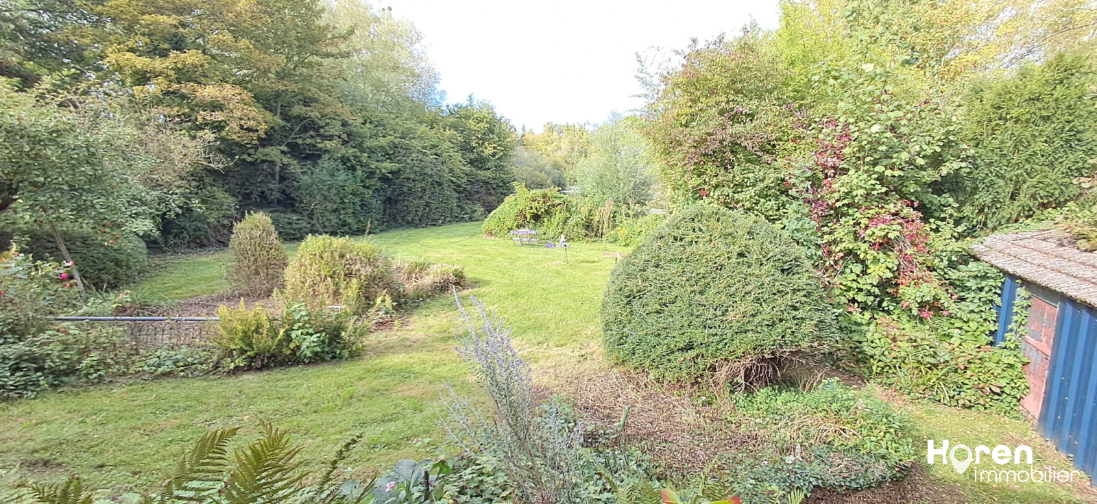 Un jardin avec étang et petite dépendance.